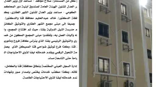 وزارة العدل تفتتح مجمع الشهر العقاري والتوثيق بمحافظة قنا